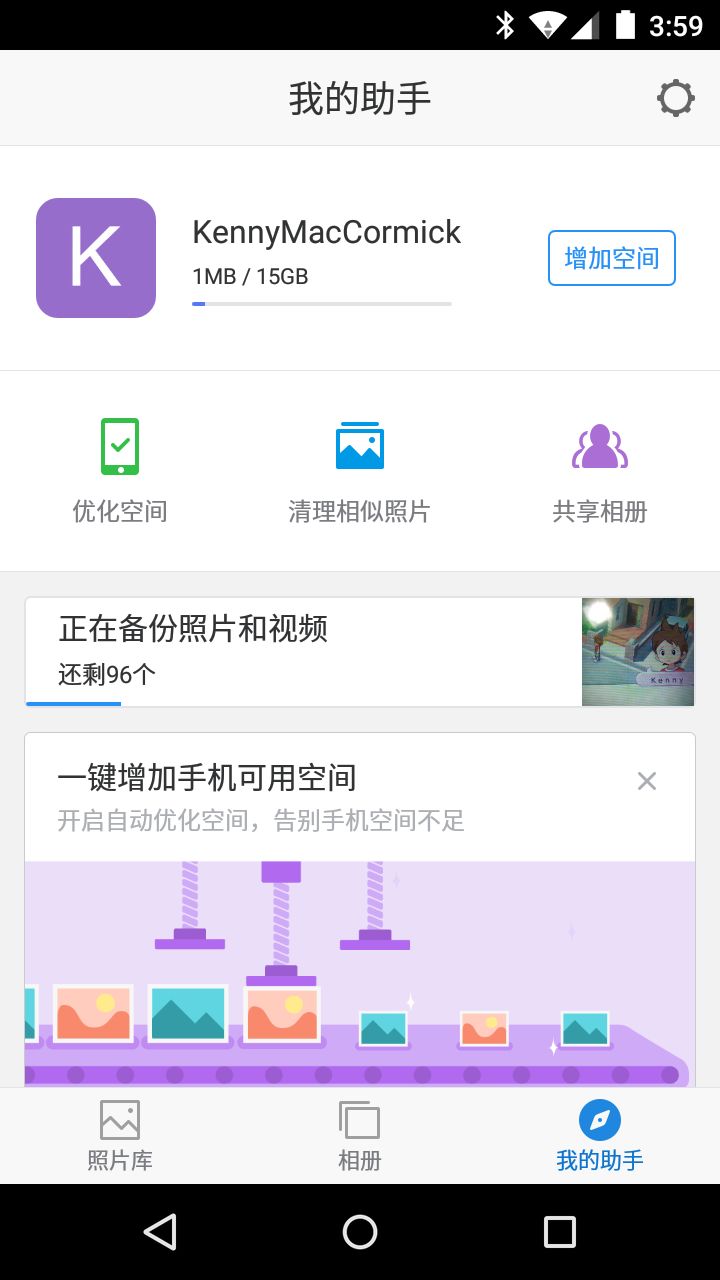 首次使用需要用微信/QQ登录或者用手机号注册,注册后即可使用云备份功能,备份完成后在“我的助手”页面选择“优化空间”,即可从本地电脑移除已保存到云端的照片。